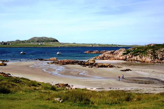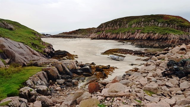 Fionnphort. Looking over to Iona. Ross of Mull Granite on the RHS and forming the large split boulder on the shore