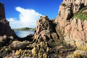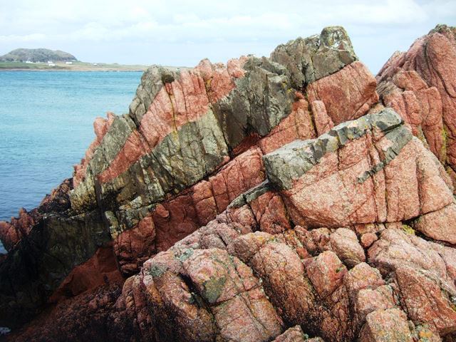 From the ferry slipway, it is only a short distance to the south where some very interesting intrusions of a dark grey rock cutting the granite can be seen. The rock is a diorite and is seen to inter-digitate with the contrastingly pink granite. Large crystals of K-feldspar can be seen in the grey material. these are xenocrysts and it is reckoned that the pink granite was not completely solidified when the grey dioritic rock was intruded. Crystals of the pink K-feldspar in the granite were broken of and incorporated in the diorite.