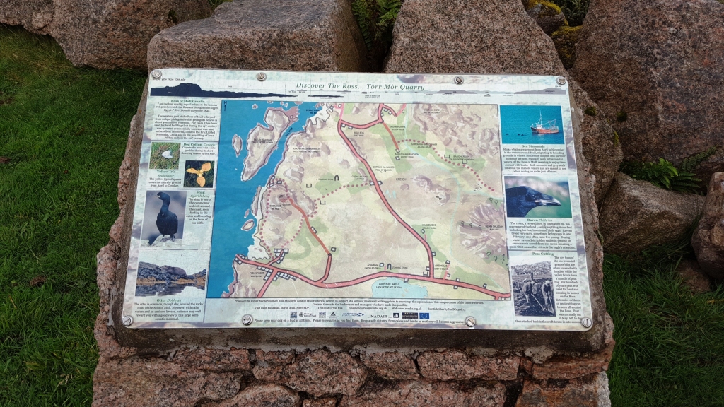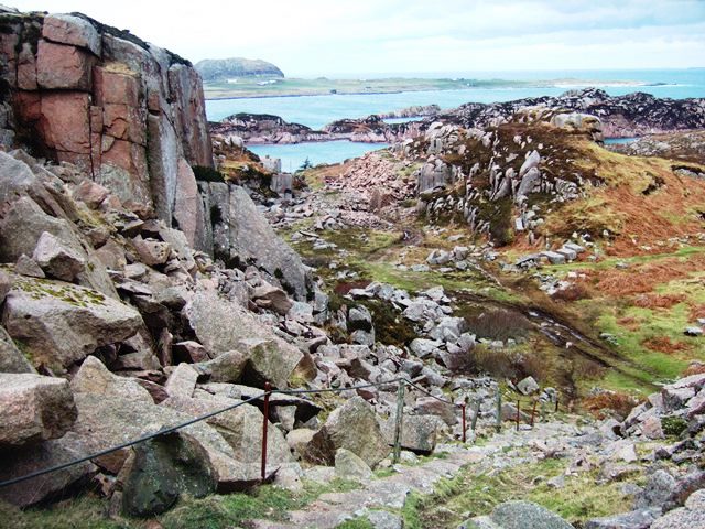 Tormore Quarry lies to the north of Fionnphort and is accessible by a muddy track from the top of the main car park or else by a rough road which runs past the Ninth Wave Restaurant. Large blocks of granite lie in the quarry and it is a great place to see evidence of how the blocks were cut and transported. The top of the quarry has superb views to the north and west and looks straight over to Iona.