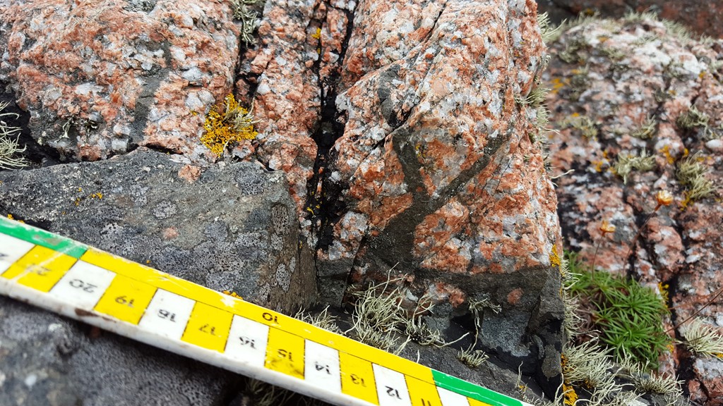 Just south of the slipway, intrusions of diorite (grey) cut across the granite (pink)