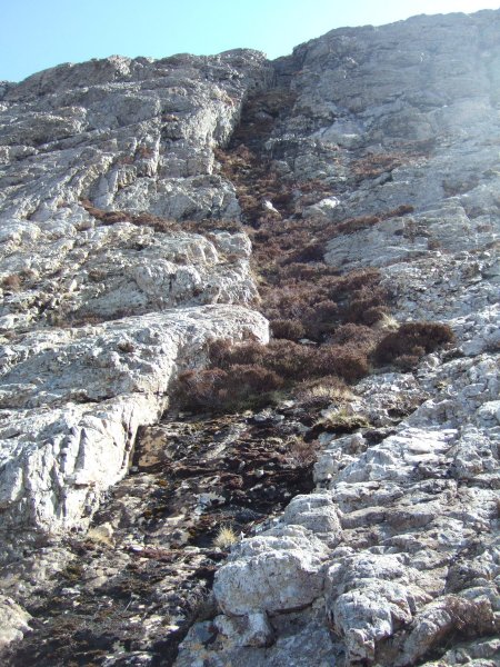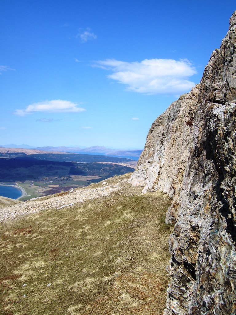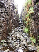 The LBRD, although late in the Mull igneous activity, was not the last intrusive event however. The LBRD itself is cut by several dykes of the Mull Swarm. Some of these have been eroded out to form a deep chasm cutting across the ridge as can be seen in the picture below.