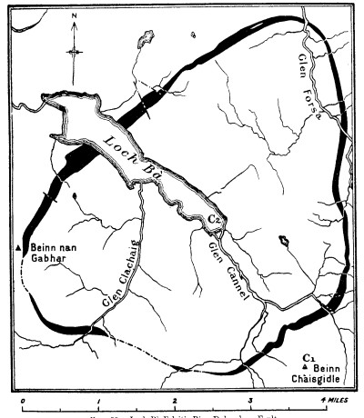 The dyke is not continuous it stands out well on the NW side of Loch Ba and also on the SE side of the same loch, but it is not so obvious further round the ring fault. In most places it is only visible in stream sections and is not seen on the open hillside.