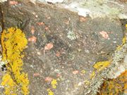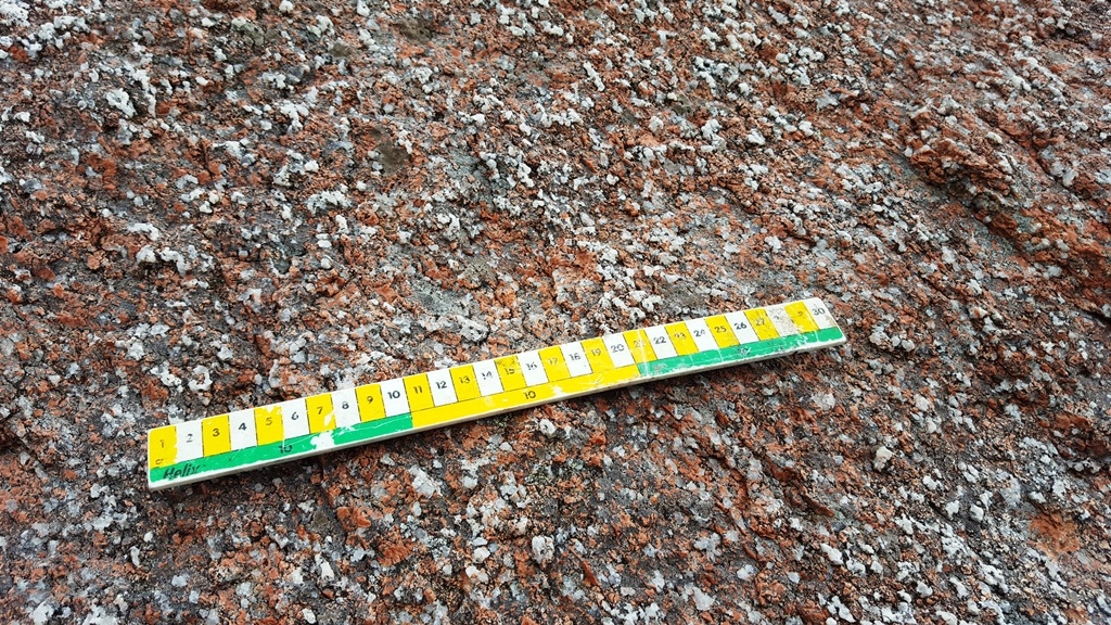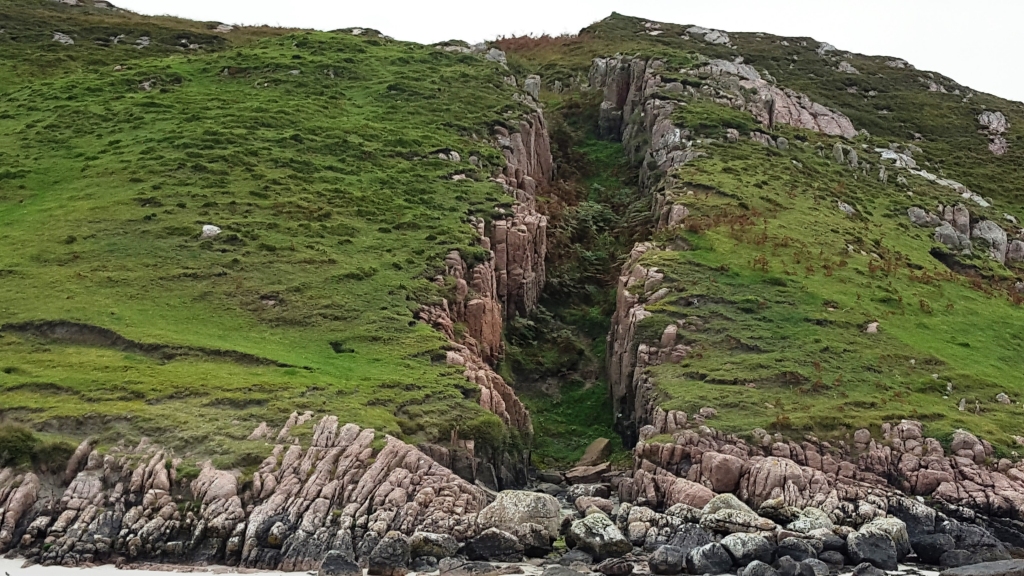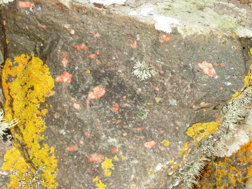 From the ferry slipway, it is only a short distance to the south where some very interesting intrusions of a dark grey rock cutting the granite can be seen. The rock is a diorite and is seen to inter-digitate with the contrastingly pink granite. Large crystals of K-feldspar can be seen in the grey material. these are xenocrysts and it is reckoned that the pink granite was not completely solidified when the grey dioritic rock was intruded. Crystals of the pink K-feldspar in the granite were broken of and incorporated in the diorite.