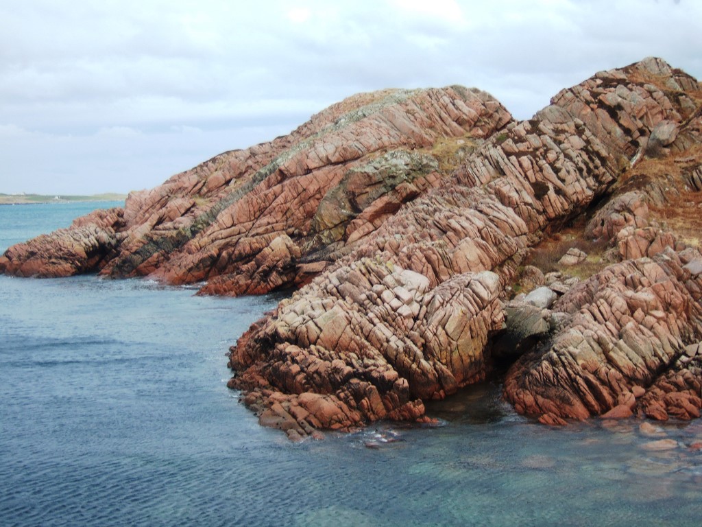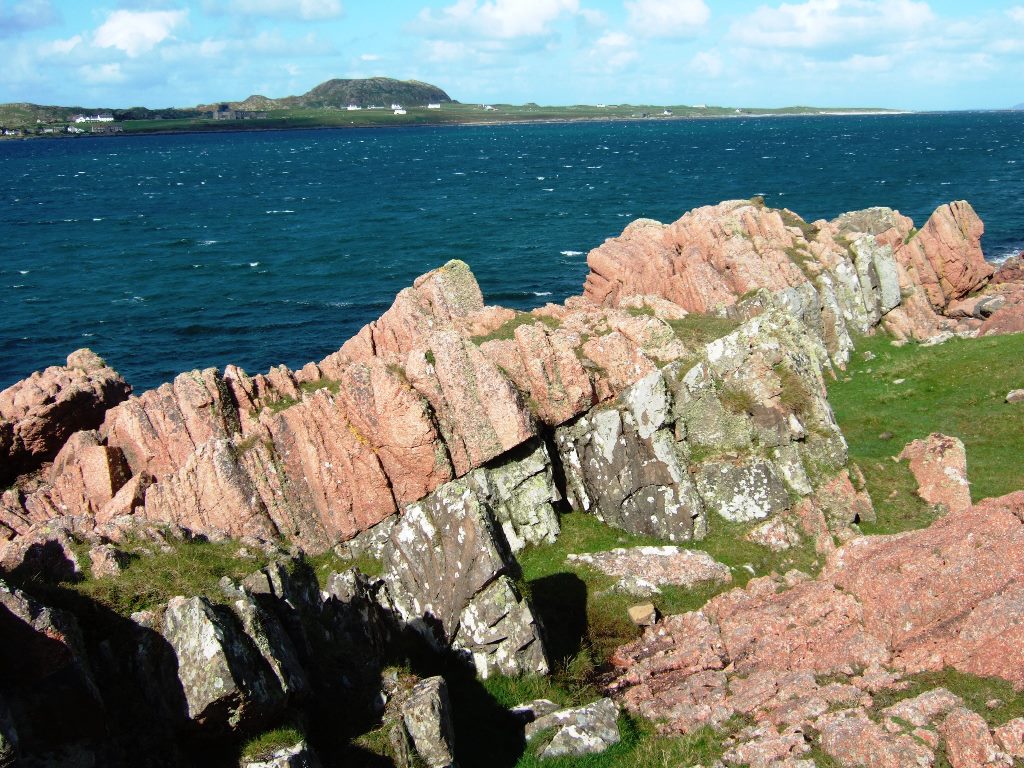 Fionnphort in the SW of mull at the end of the peninsula called the Ross of mull is a great place to see the well exposed Ross of Mull Granite. The pink granite looks very distinctive , especially in the rays of the setting sun where its pink colour (due to the presence of potassium feldspar) is very striking. There are two locations that are well worth a visit. The first is just south of the ferry slipway, the other is the old quarry at Tormore just north of the village.