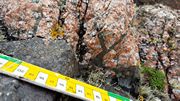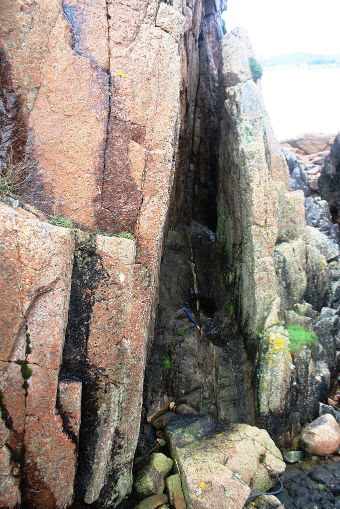 Just south of the slipway, intrusions of diorite (grey) cut across the granite (pink)