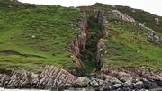 Near this location there is also an obvious fault - the band of dark grey rock has a very obvious displacement across a small steep sided gully. In the bed of the gully can be seen a small dyke - several calcite veins are visible nearby.