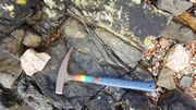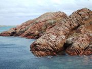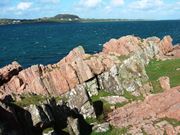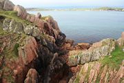 Several dykes of Permian age cut through the granite and one is visible as a large dark feature in the quarry wall. Similar dykes can be found on the shore. These tend to run E-W in contrast to the dykes of the Mull Swarm which run NW-SE. Aplite veins of much finer grained material are also found. These are best seen just offshore on the island of Eilean nam ban, but you need a boat to get out there. The Staffa tourist boat passes close to this island and the aplite veins are clearly visible from it. The granite generally appears to dip into the Sound of Iona at about 40 degrees. This feature is very noticeable in the Fionnphort slipway. Look north across the bay - it is unmistakable.