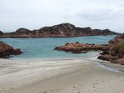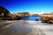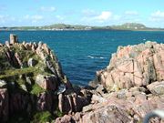 Fionnphort. Looking over to Iona. Ross of Mull Granite on the RHS and forming the large split boulder on the shore