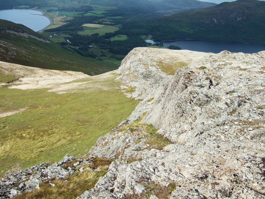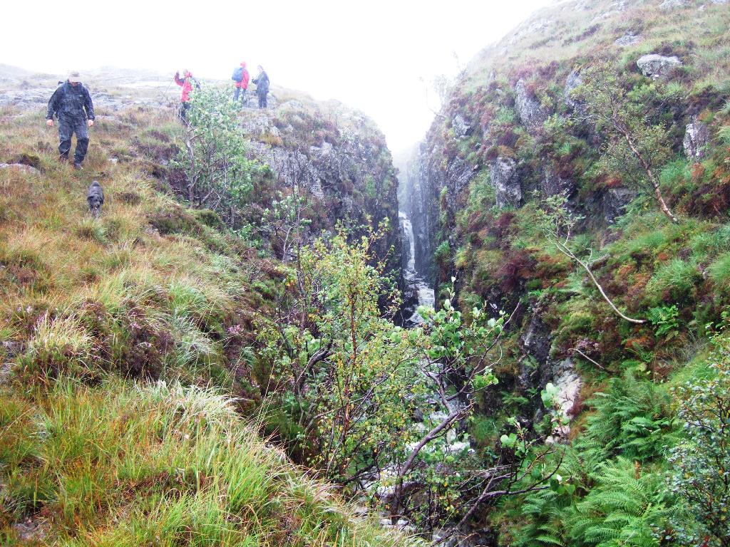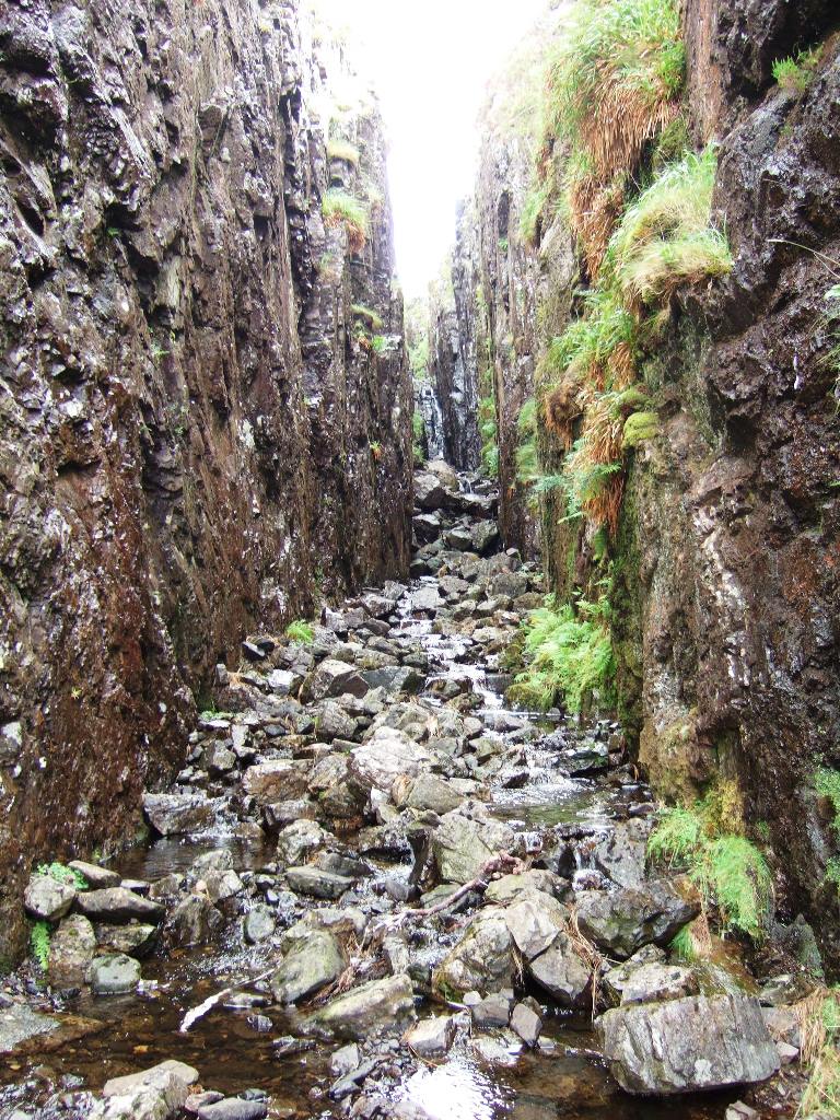 The LBRD, although late in the Mull igneous activity, was not the last intrusive event however. The LBRD itself is cut by several dykes of the Mull Swarm. Some of these have been eroded out to form a deep chasm cutting across the ridge as can be seen in the picture below.