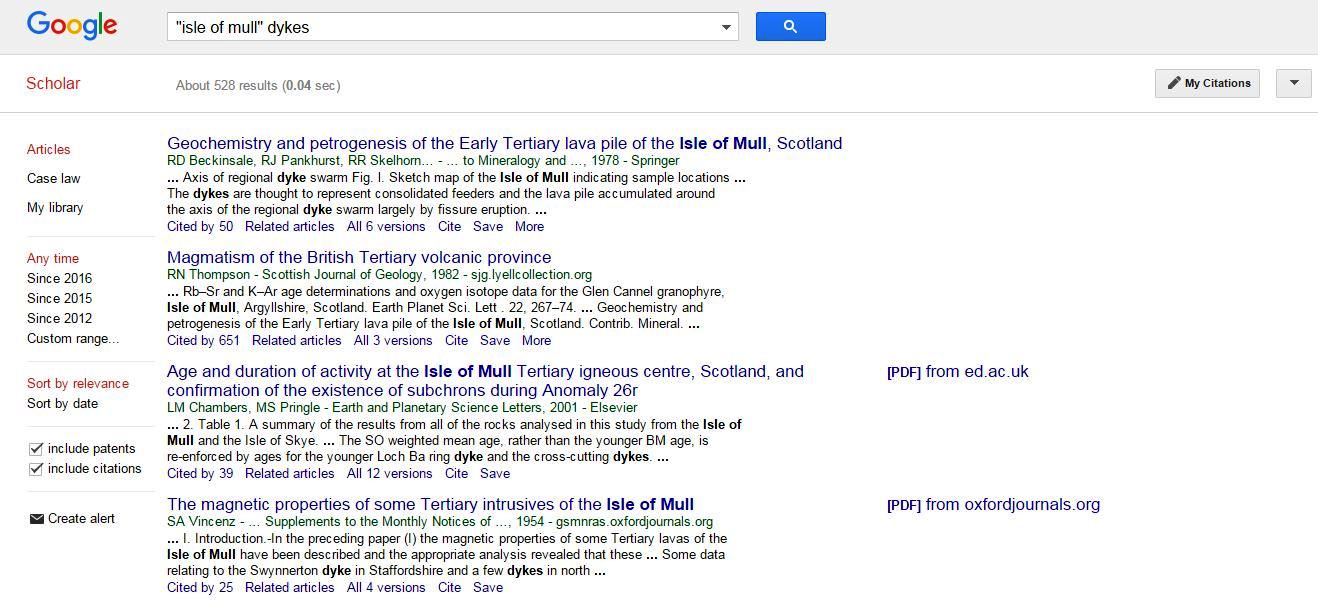 A good starting point is Google Scholar scholar.google.co.uk. Simply type in a search string like "Isle of Mull" and "dykes" and see what comes up!
