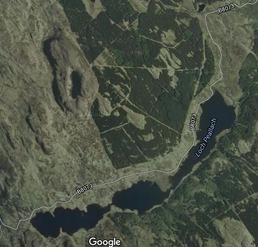 Satellite view of SAB with the Mishnish Lochs to the south. (Loch Carn an Amais, Loch a' Mheadhoin, Loch Peallach)