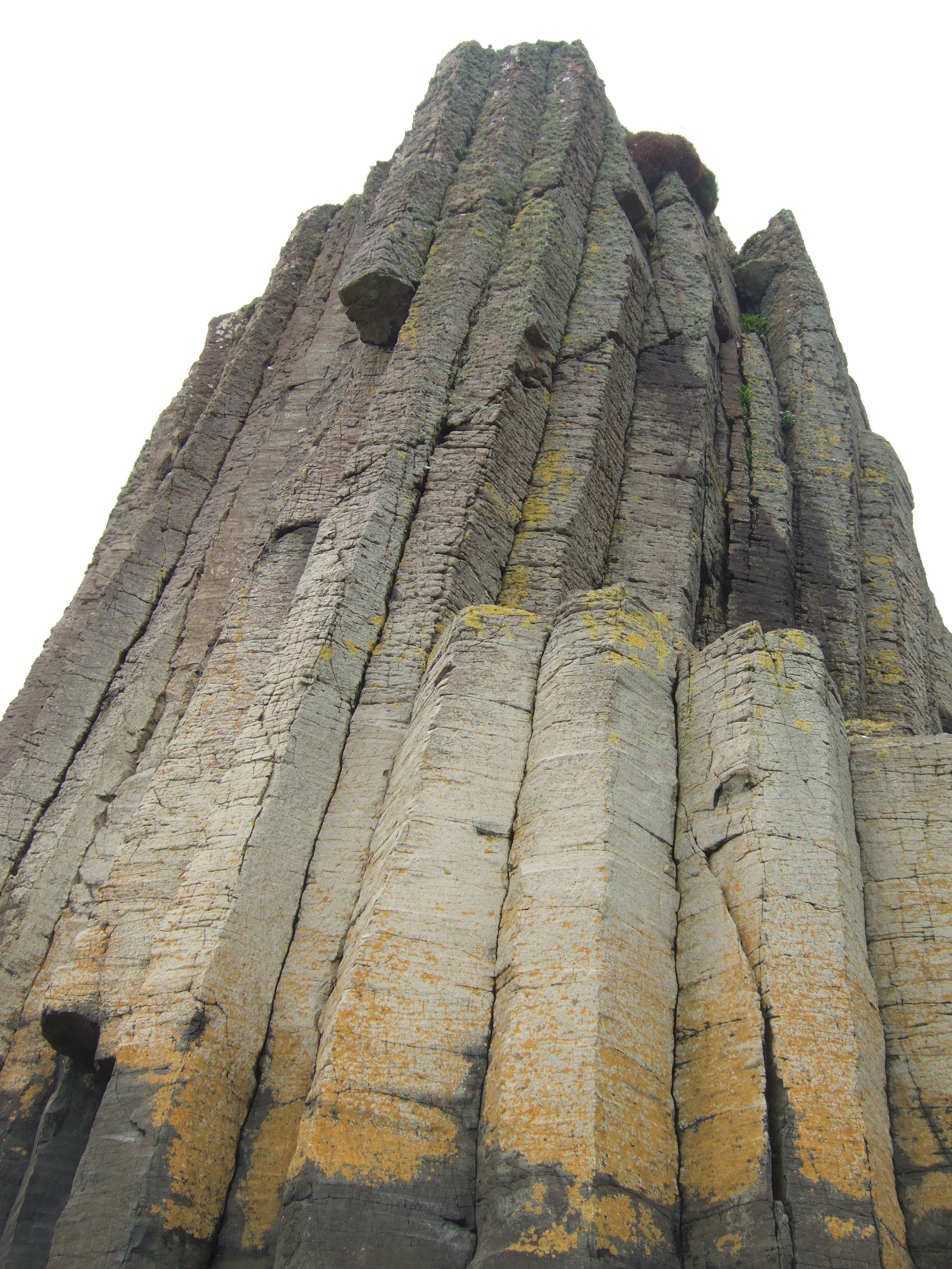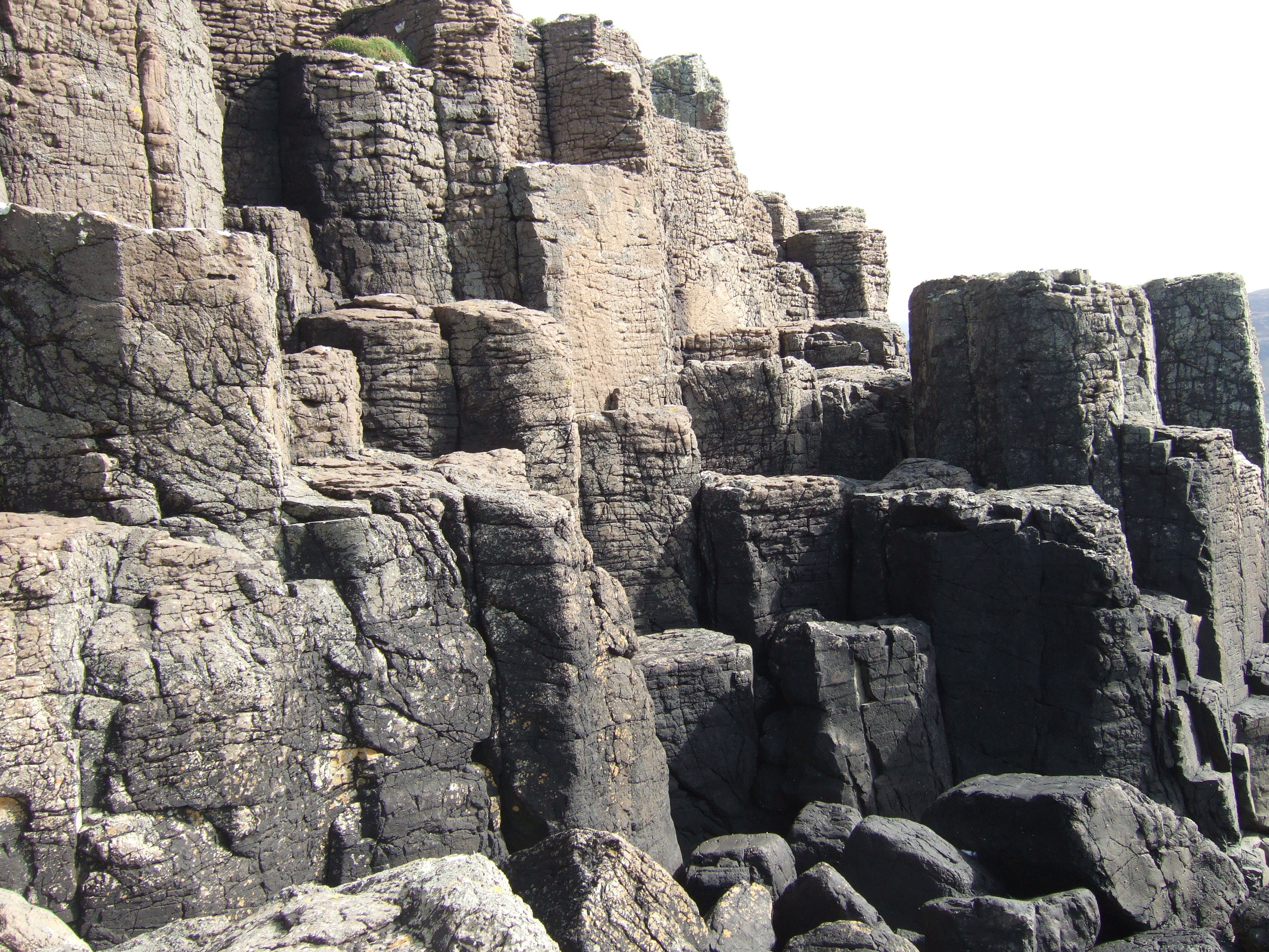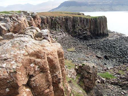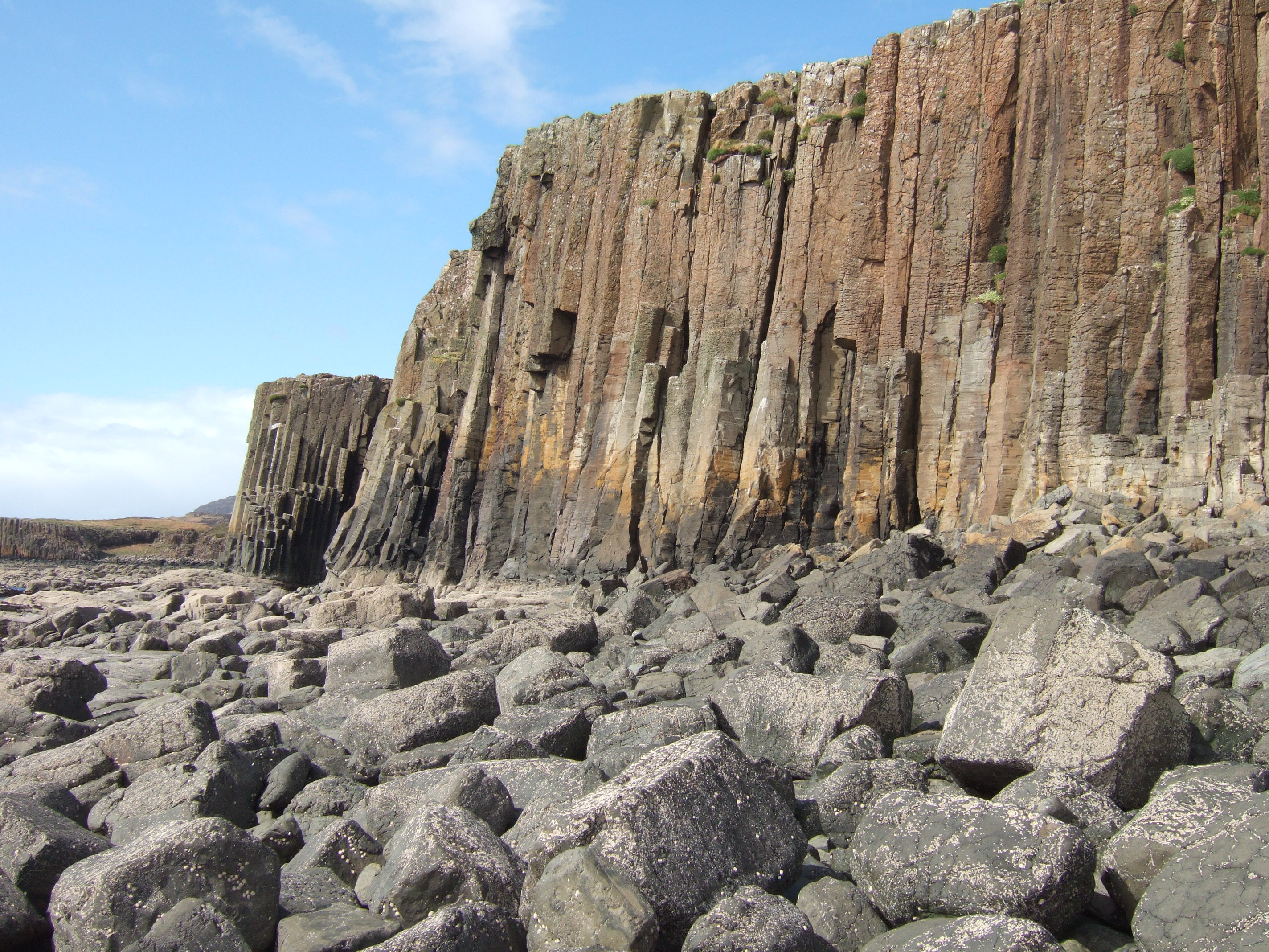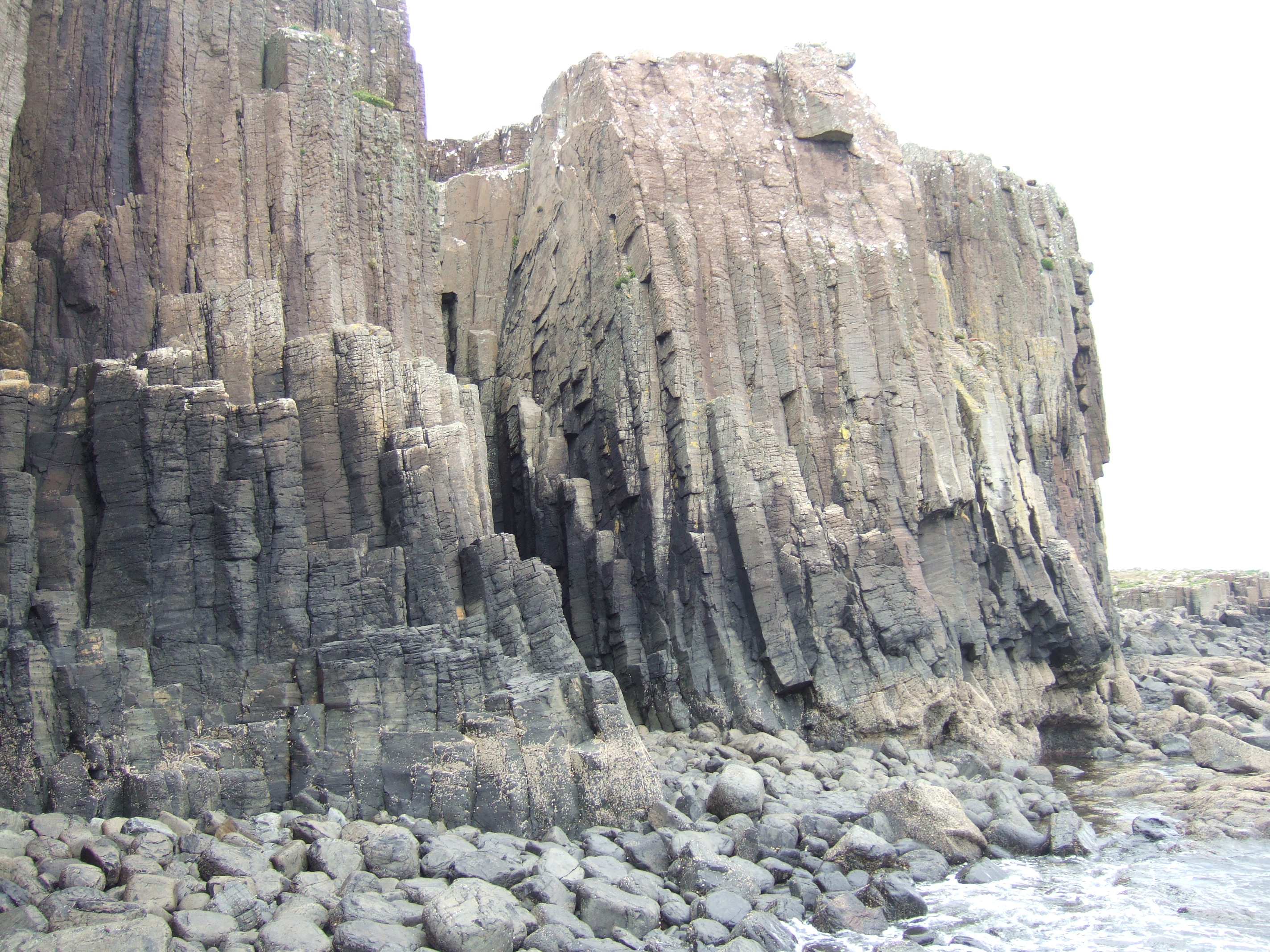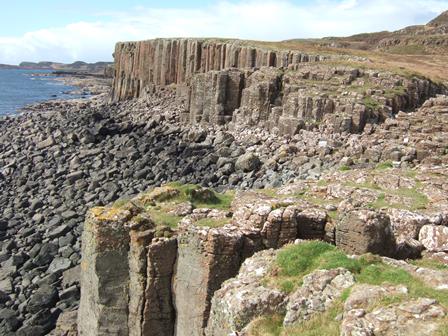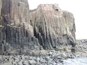 The columns are simpler in form than those seen at Staffa. They occur as a "collonade" structure without the "entablature" twisted curving columns on top that is well seen in Staffa, especially near Fingals Cave. Also there is no obvious ash deposit at the base as is again clearly seen in Staffa.